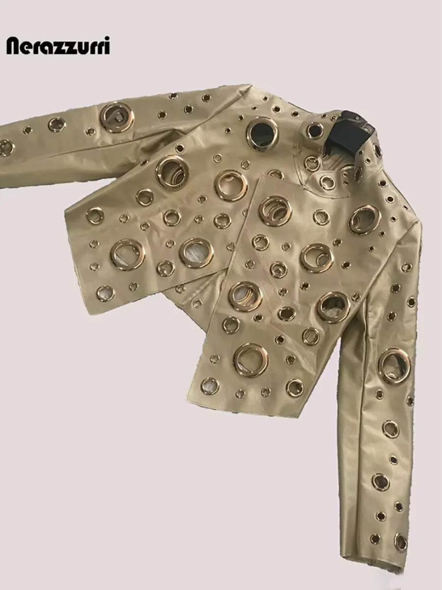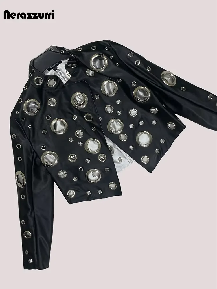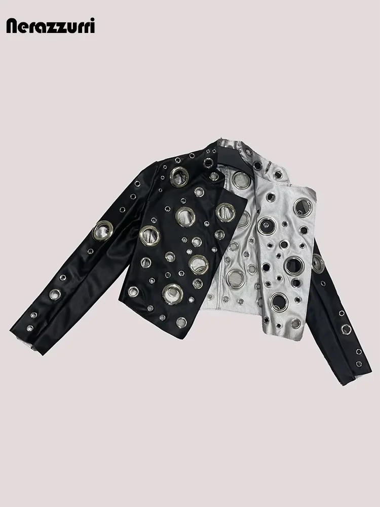 Nerazzurri Autumn Short Hollow Out Patchwork Short Pu Leather Jacket Women Plus Size Luxury Designer Punk Style Streetwear 5xl