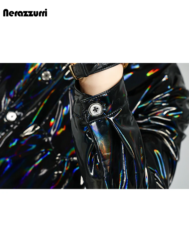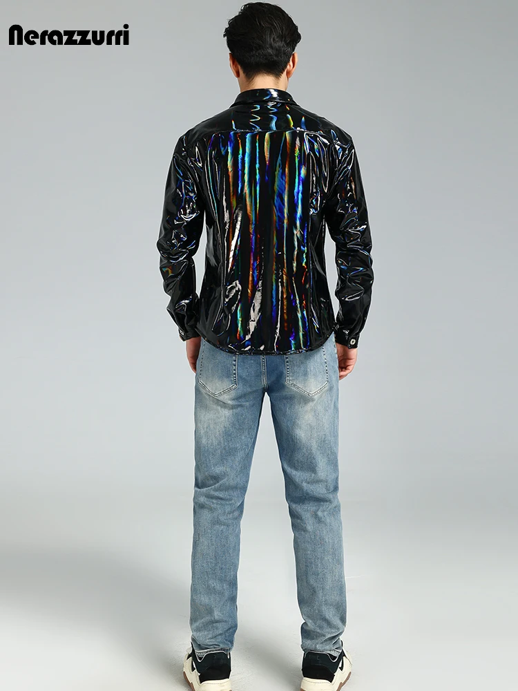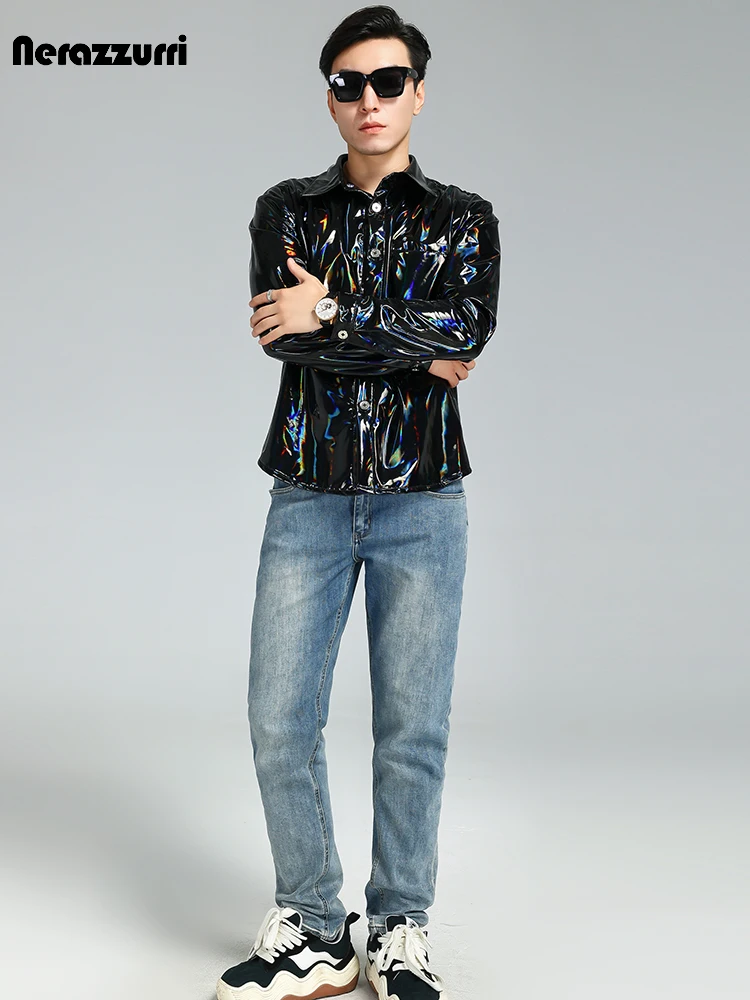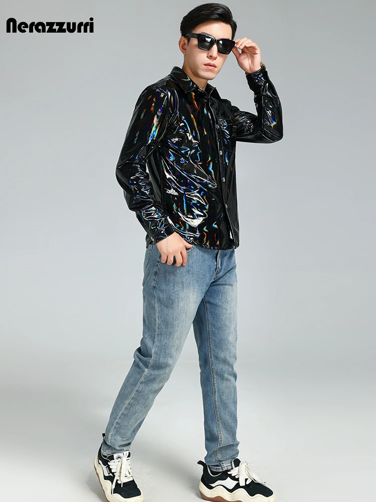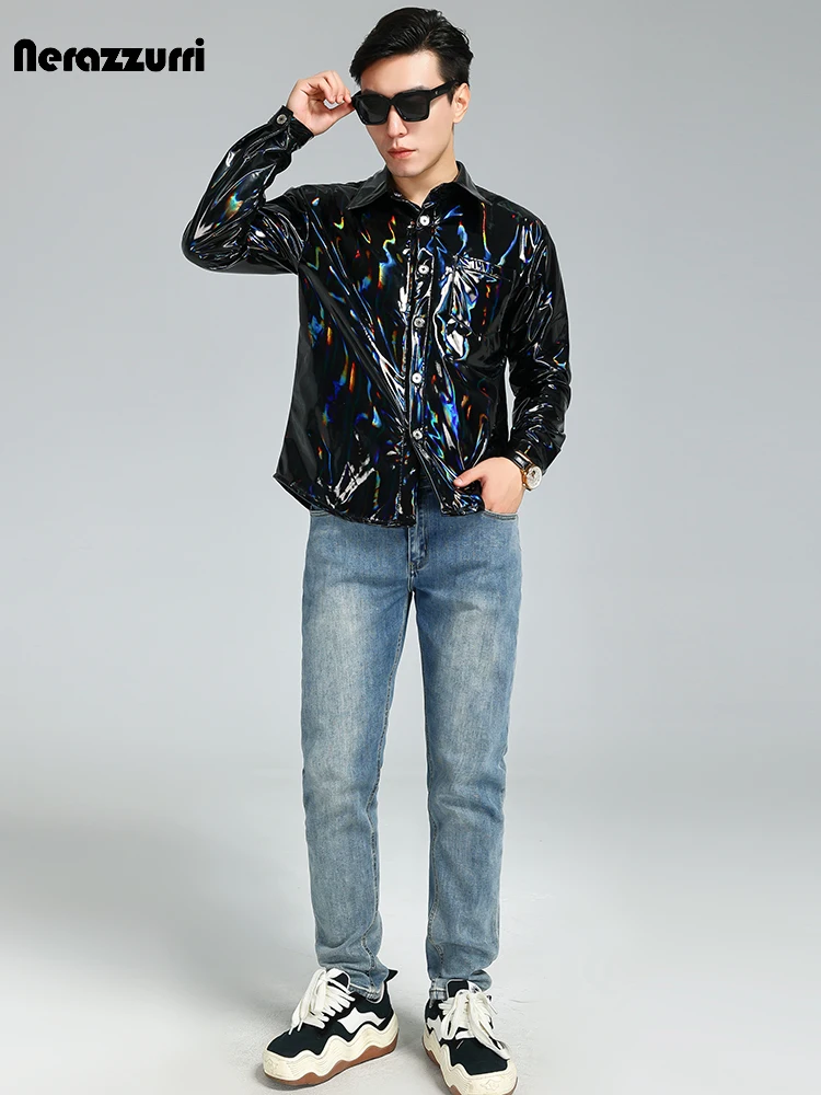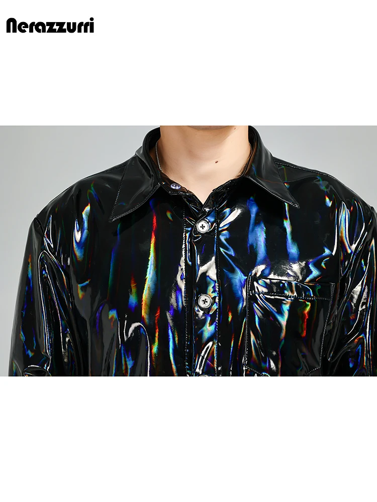 Nerazzurri Spring Autumn Cool Handsome Short Black Hologram Shiny Reflective Patent Faux Leather Shirt Men 2023 Leather Jacket