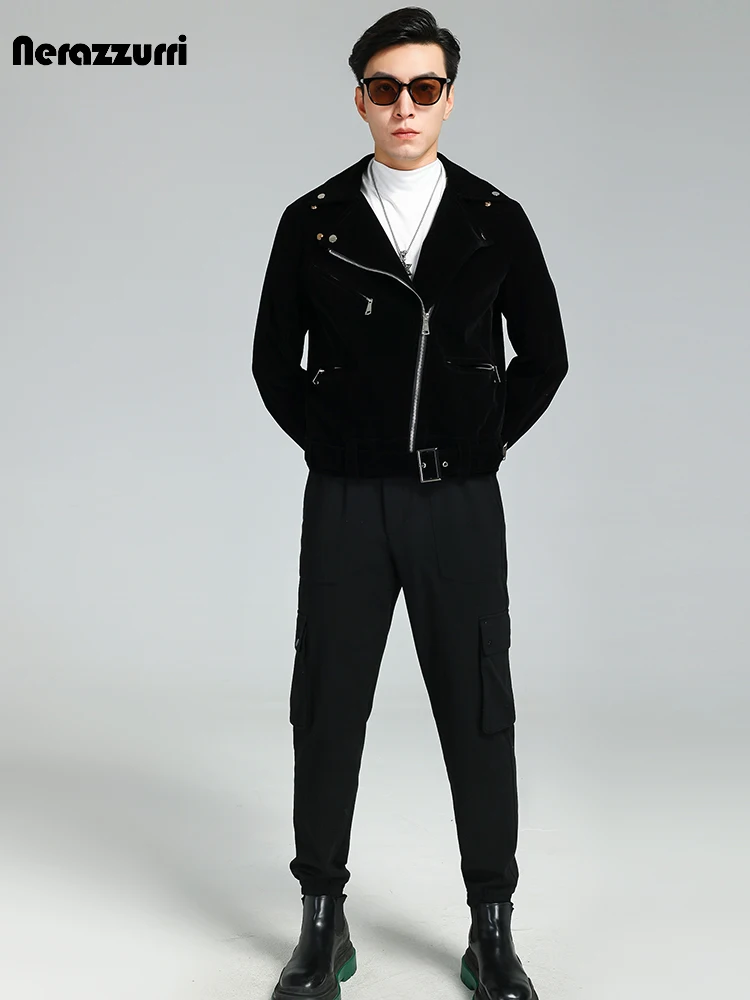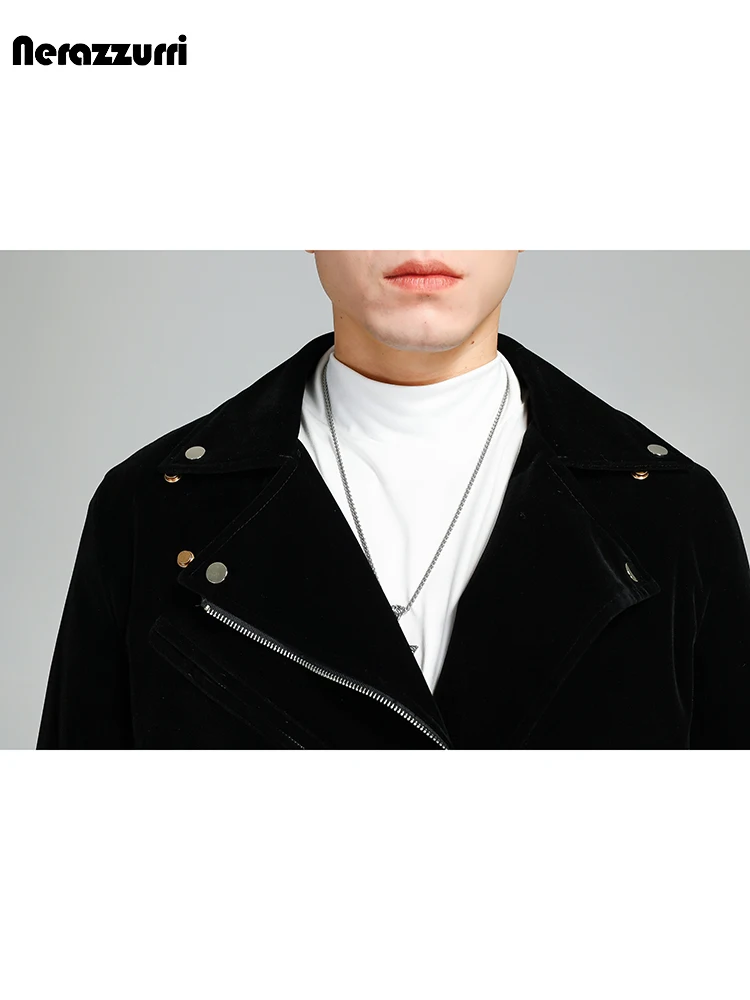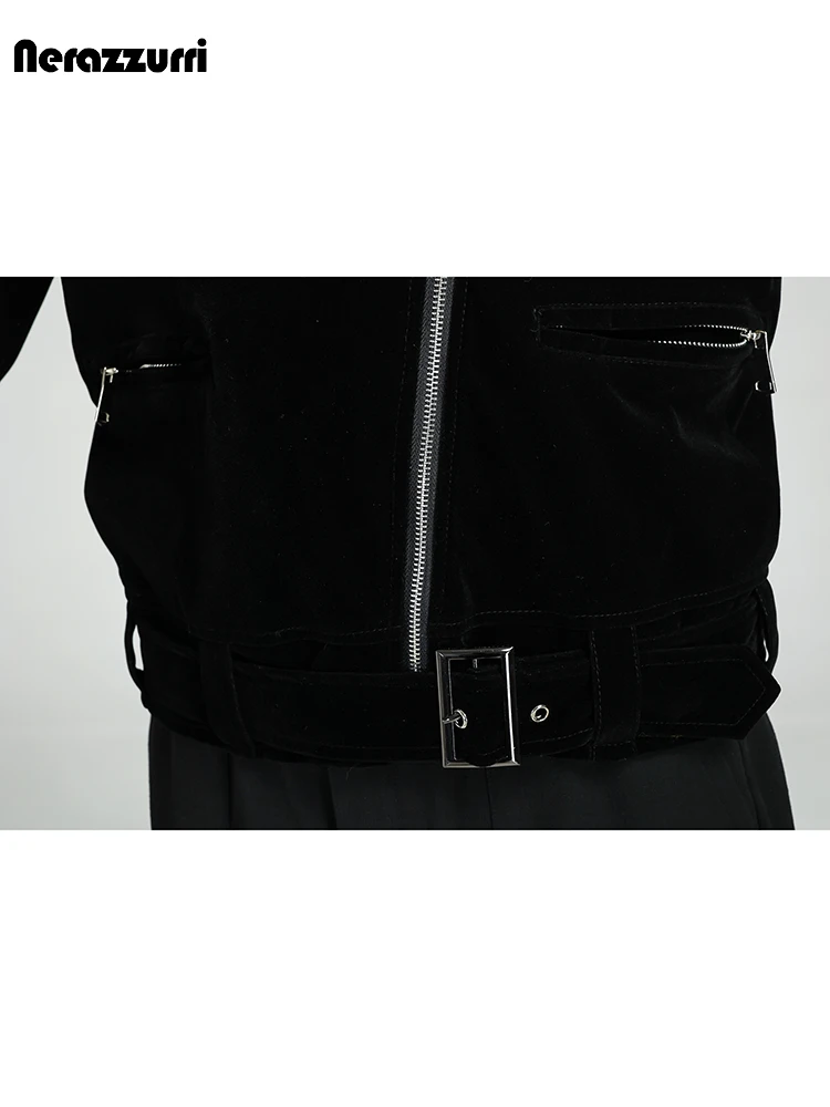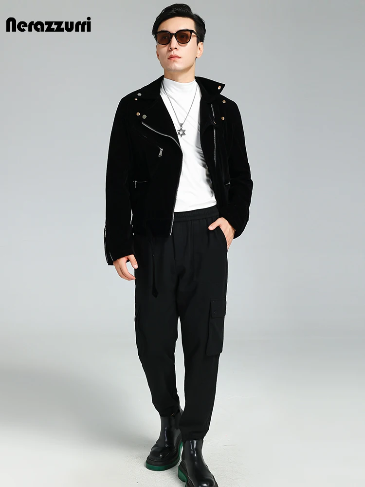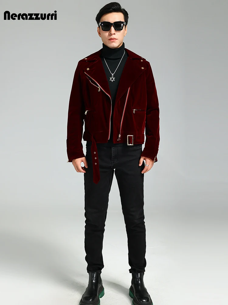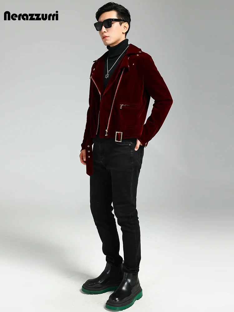 Nerazzurri Spring Autumn Cool Handsome Short Burgundy Black Velvet Moto & Biker Jacket Men Long Sleeve Luxury Designer Clothing