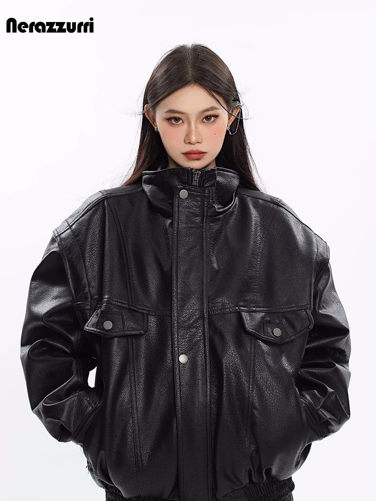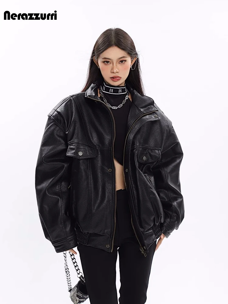 Nerazzurri Spring Autumn Oversized Cool Windproof Thick Black Pu Leather Jacket Women Zip Up Luxury Designer Unisex Clothes 2023