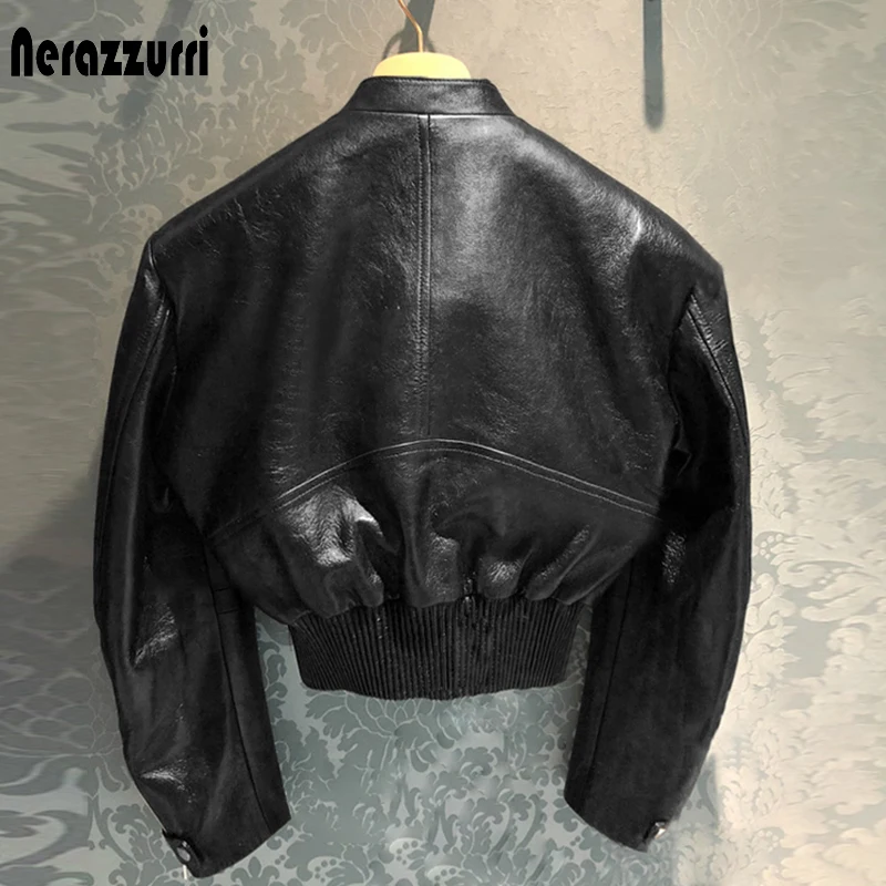 Nerazzurri Spring Short Patchwork Faux Leather Jackets for Women Long Sleeve Zipper Crop Top Runway Designer Clothes Fashion